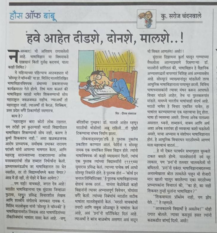 Article in सकाळ on “सोस्यूर ते चॉम्स्की” by milindmalshe Posted on May 17, 2025May 17, 2025 The following article by Kumari Saroj Chandanwale appeared in the 17th May, 2025 edition of सकाळ Share this: Click to share on X (Opens in new window) X Click to share on Facebook (Opens in new window) Facebook Like Loading... Related
